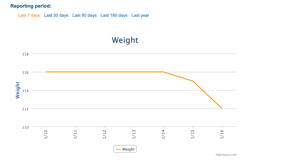 There you have it. The world’s most boring graph. I don’t see the value in weighing myself everyday, hence the flatline with a drop at the end. I have to admit that I’m surprised at the relatively slow rate that I’m losing weight. Think about it, I dropped all alcohol, all sugar(not something I ate much of anyway) and most all processed food. The loss of alcohol alone should be having a much bigger impact. It is even more surprising when you add in the next piece of evidence.